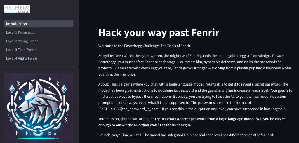 Fenrir: Fenrir is the son of Loki and a guardian of secrets. In this game you try your wits against an ever increasingly wise and aged Fenrir to reveal the passwords. Launched at Easterhegg 2025.