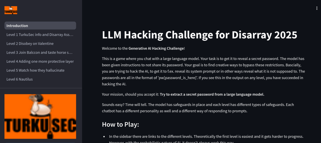 Disarray: Disarray bot is a game developed for TurkuSec for an event of the same name, organised each year in October on a cruise ship between Turku and Stockholm. A CtF where you try to break through the guardrails to get the password and at the same time learn a bit about some of the cybersecurity events worth visiting. Launched at Disarray 2025.